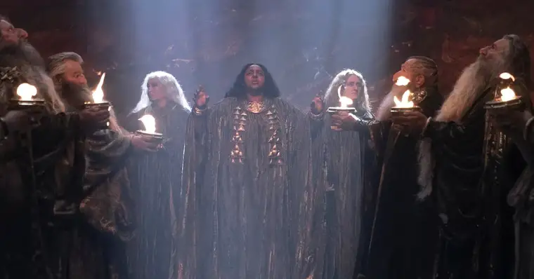 O último episodio da primeira temporada de Os Anéis de Poder nos trouxe um confronto cheio de magia. Depois do choque inicial de que O Estranho poderia ser Sauron, vemos o grupo de Pés-Peludos unindo forças para tentar resgatá-lo do perigoso trio de mulheres de branco. Toda a cena é eletrizante, especialmente porque há um contraste de poder gritante entre os pequenos Pés-Peludos e as servas de Sauron. Mas quando tudo parecia estar perdido, O Estranho finalmente decide dar ouvidos ao que a jovem Nori estava dizendo, tomando um cajado em suas mãos e combatendo o trio com toda sua força.