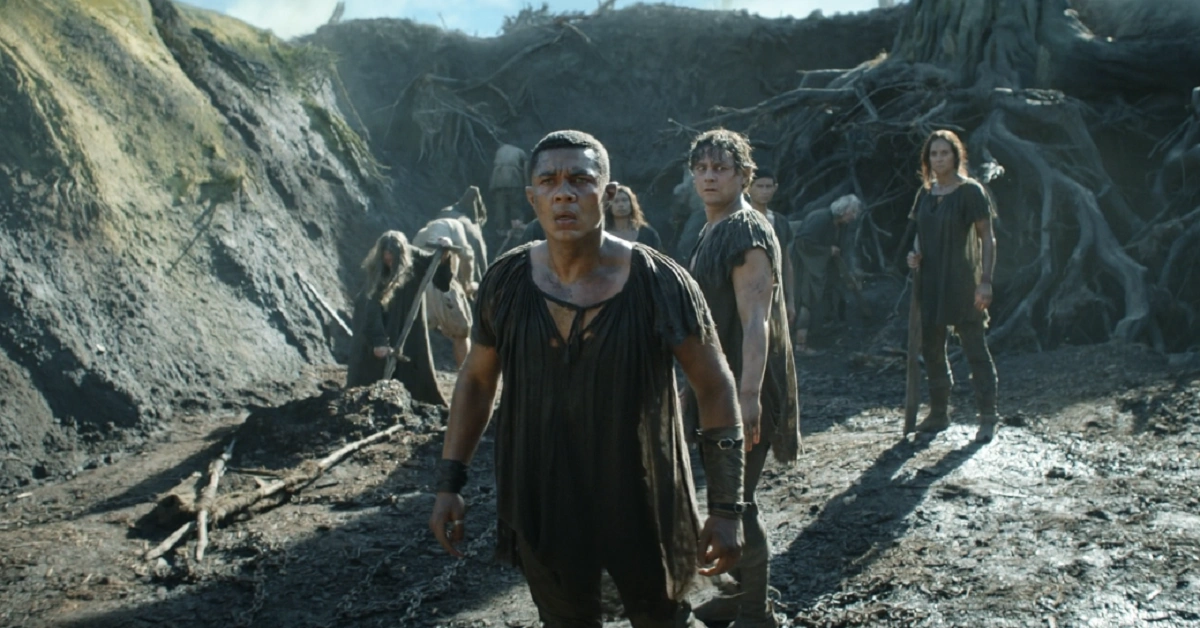 Concomitante, acompanhamos Galadriel em uma visita a Halbrand, que está preso em um calabouço depois que se meteu em confusão. Ali, Galadriel mostra um símbolo de uma bandeira para Halbrand e diz que, há muito tempo atrás, um homem tinha unido tribos espalhadas pelas Terras do Sul com aquela flâmula e que, agora, isso poderia se repetir. É assim que temos algumas revelações sobre o passado de Halbrand. Como Galadriel diz, relembrando uma fala do sujeito quando se apresentou para ela, “seu povo não tem rei porque o rei deles é você”. Em vista disso, Halbrand tem uma ancestralidade nobre, algo que ele admite, já que não há outra alternativa. Mas ele diz a Galadriel que não é o herói que ela procura, pois seus ancestrais tinham feito “um voto de sangue a Morgoth”. Contudo, Galadriel não fica abalada por isso. A Elfa acredita que o encontro dos dois não foi uma obra do acaso e que algo maior fez com que eles se esbarrassem no mar. Assim, ela pede ajuda a Halbrand, revelando que planeja uma forma de fugir da ilha. Antes de deixarmos Númenor, há uma breve cena com a Rainha-Regente Míriel. Nela, a governante caminha até seu pai, que não vemos, e diz que o “momento que eles mais temiam tinha chegado”. Sem dar muitos detalhes, Míriel fala apenas que a Elfa estava ali, fazendo uma referência a Galadriel. Podemos esperar revelações importantes nos próximos capítulos a partir disso. Já os Pés-peludos finalmente começam seu processo de migração, e a família de Nori, no fim da caravana, enfrenta alguns problemas de locomoção por causa do tornozelo lesionado de Largo. É num momento de pausa para respirar que o Estranho aparece chamando Nori de “amiga”, e todos aceitam sua companhia na jornada. Os últimos acontecimentos do episódio são protagonizados por Arondir. Acompanhamos uma cena eletrizante no campo de trabalho forçado, onde o povo escravizado pelos orques se voltam contra eles numa tentativa de escapar dali. A luta é intensa e os orques se organizam conforme o povo tenta quebrar as correntes que os prendem no local. Arondir logo aproveita suas habilidades como soldado para expor as criaturas ao sol, atrapalhando seu avanço. Porém, ele só não contava com a presença de um terrível warg, uma espécie de lobo que é libertada pelos orques. O animal simplesmente mata loucamente alguns dos servos, mas Arondir consegue segurá-lo por tempo o suficiente para que um de seus colegas quebre a corrente que o mantém ali. Enquanto o homem foge, Arondir continua distraindo os orques até que ele mesmo consegue subir na superfície da cratera apenas para ver o aliado ser morto por flechadas. Os orques derrubam Arondir no imenso buraco e parecem prontos para matá-lo, mas um deles pede para que o Elfo seja levado a Adar.