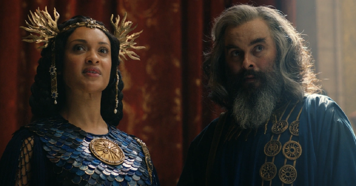 Não temos tempo para ouvir mais detalhes sobre a história de Númenor, já que o capitão escolta Galadriel e Halbrand até um grande salão, onde são recebidos pela Rainha-Regente Míriel e um grupo de habitantes da ilha. Míriel logo pede para que a dupla se apresente e Pharazôn, seu conselheiro, demonstra admiração por um Homem e uma Elfa estarem juntos. Galadriel explica como os dois se encontraram e diz que o capitão do navio os salvaram do pior. Assim, a Elfa pede que eles lhes concedam passagem para a Terra-média, um pedido que gera uma comoção negativa entre todos que estão presentes ali. Há uma troca de farpas entre Galadriel e Pharazôn a respeito da rivalidade entre as duas espécies, mas a Elfa está determinada a conseguir o que quer, desafiando a Rainha-Regente. Percebendo os rumos que aquela conversa estava tomando, Halbrand tenta amenizar a situação e propõe que os dois fiquem em Númenor por alguns dias enquanto eles avaliam o pedido de Galadriel. Os superiores de Númenor aceitam o acordo com a condição de que eles não tentem fugir da ilha, algo que deixa Galadriel revoltada por achar que ela está sendo tratada como uma prisioneira. Em vista disso, Halbrand diz para a Elfa que aquele lugar é um paraíso e que ele está disposto a desfrutar da paz que a ilha pode oferecer, algo que também poderia “fazer bem para ela”. No final da conversa, Halbrand entrega para Galadriel sua espada, que tinha sido confiscada pelo capitão do navio. Ainda em Númenor, acompanhamos uma interação entre a Rainha-Regente e Pharazôn, que diz para ela que é melhor resolver a questão de Galadriel antes que algo ruim aconteça. Míriel, então, chama o capitão do navio que levou a Elfa até a ilha.