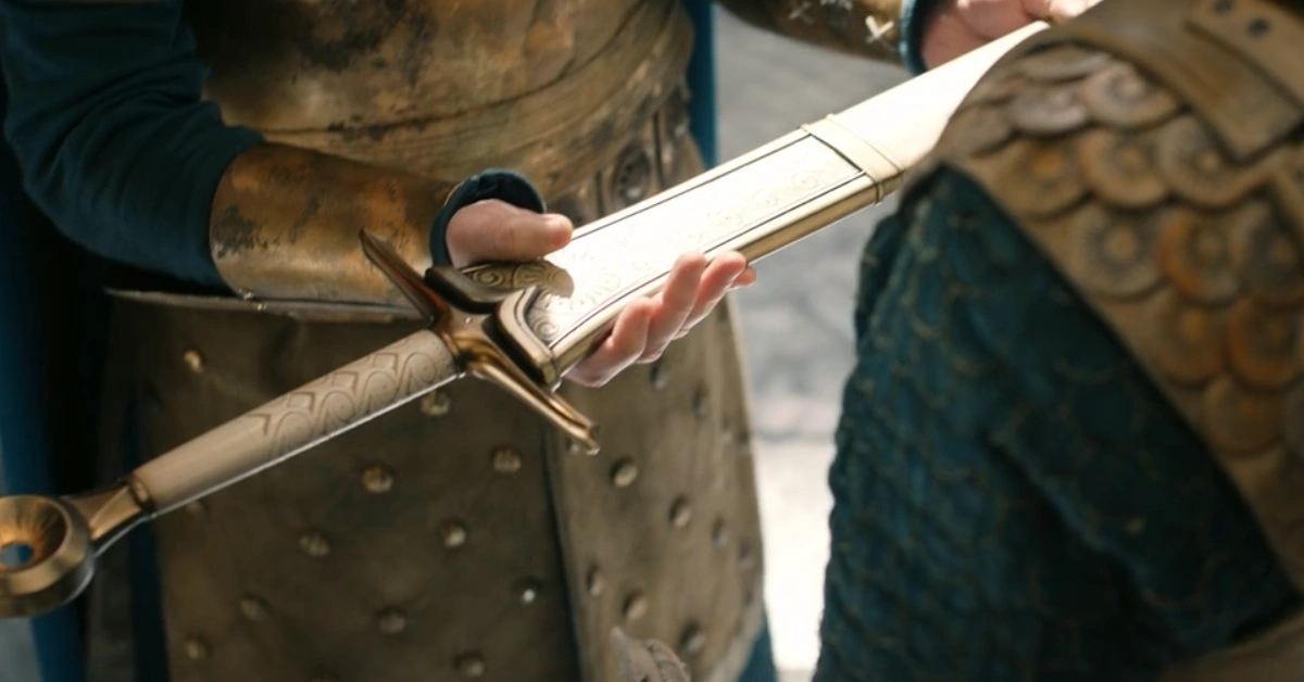 Vemos a tripulação tentando içar velas, mas a cabeça de Isildur está em outro lugar. Sua distração só se confirma mais ainda quando um dos cadetes quase é lançado para fora da embarcação enquanto eles tentavam içar as velas do navio. Após retornarem à ilha, os colegas de Isildur comentam sobre o estado disperso do amigo, mas ele tenta desconversar quando é recebido por Eärien, sua irmã. Voltamos então para a conversa da Rainha-Regente com Elendil. Míriel questiona o capitão sobre sua lealdade, mencionando o significado do próprio nome de Elendil, que quer dizer “amigo dos Elfos”. Para ela, sua atitude de salvar Galadriel é motivo para desconfiança, mas Elendil não se deixa abalar e afirma com veemência que é um “servo leal” de Númenor e fez aquilo que acreditava ser o certo. Partindo de suas considerações, Míriel diz que tem uma tarefa para Elendil. Logo, um soldado caminha até o comandante, entregando para ele a icônica espada Narsil, que está em perfeito estado naquela época. Caso você não se lembre, o objeto foi fundamental na luta contra Sauron, no final da Segunda Era. O momento aparece no prólogo de A Sociedade do Anel e é de extrema importância para o arco de Elendil.